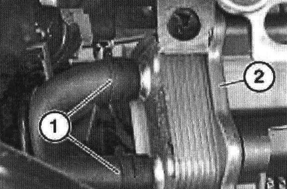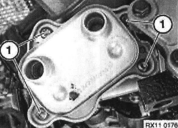 Remove heat exchanger retaining bolts (1) and remove heat exchanger.