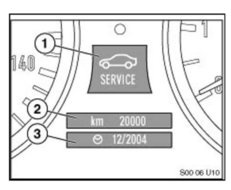 A. The Service Need Display (SBA) , located in the Instrument Cluster under the Speedometer, is the evolution of the SIA4 Service Interval Display. When the ignition (KL15 Terminal) is on, the SBA appears briefly. The first line specifies the mileage range before the next service is due. The second line, displayed by a clock symbol, specifies the time range before the next service is due. If service is overdue, a minus sign ("-") will appear with the overdue mileage or time.