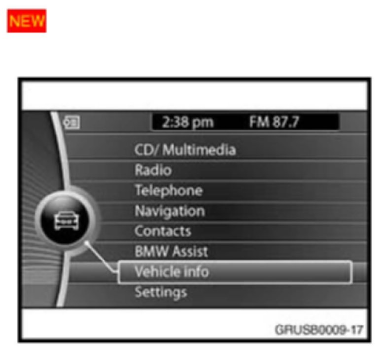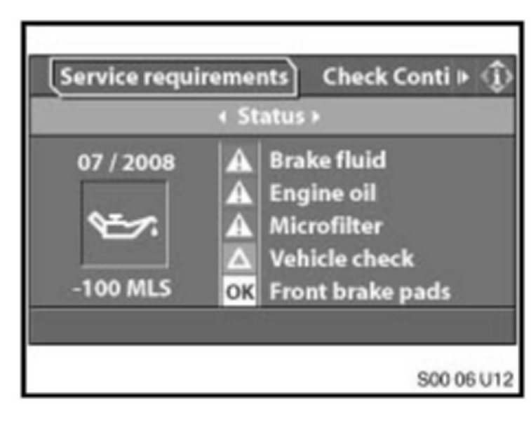 For vehicles with a CIC (Car Information Computer): from the start screen, select Vehicle Info / Vehicle status / Service required.