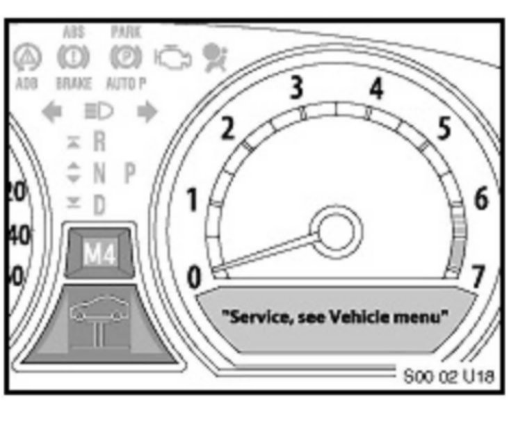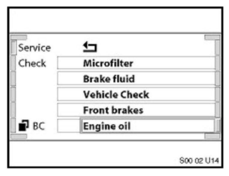 3. The upper display in the Instrument Cluster will be illuminated with a Service Item (example: An oil can is the designation for Oil Service). The lower display in the Instrument Cluster will indicate the remaining time or mileage left for that Service Item (example: 14000). Pressing the button repeatedly will allow the display to scroll through all of the Condition Based Service Items.