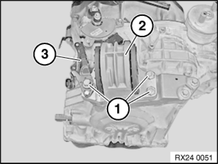 Remove transmission support block (2) and bracket (3).