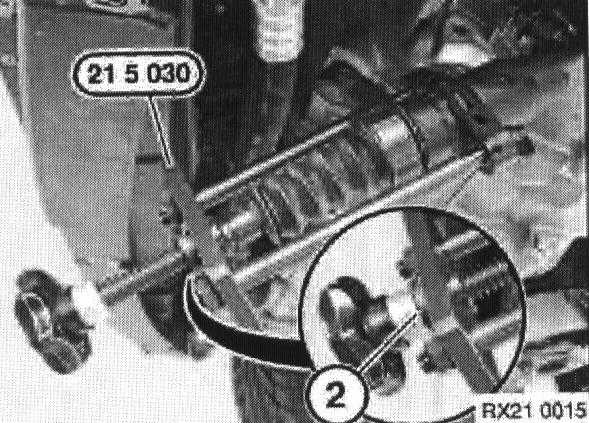 Fit special tool 21 5 030 to slave cylinder and tighten tool to stop (2).