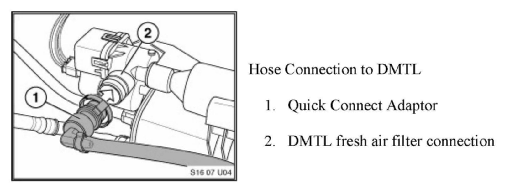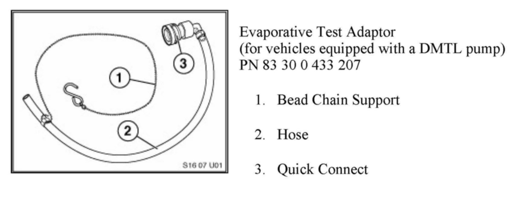 Shown above is a new test tool which can connect directly to DMTL (Diagnosis Module Tank Leakage) pump equipped vehicles only after the fresh air filter connection has been removed.