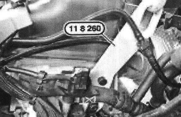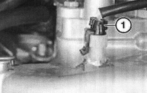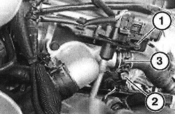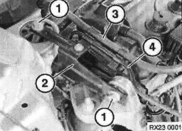 Remove oxygen sensor bracket bolt (1) and coolant pipe bolt (2).