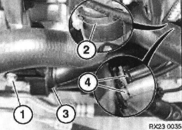 Remove supercharger inlet pipe (3) to access pipes (4).