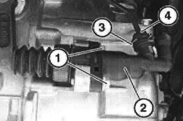 Remove clutch slave cylinder retaining bolts (1) and release clutch slave cylinder (2). Remove retaining clip (3) and disconnect pipe (4).