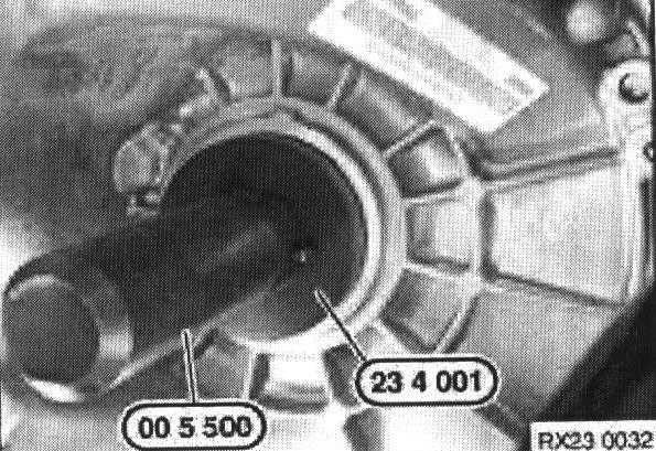 Using special tool 00 5 500 and special tool 23 4 001 fit seal into casing until the outer seal ring is flush with the transmission casing.