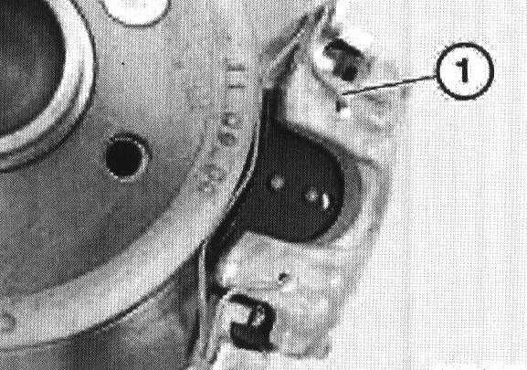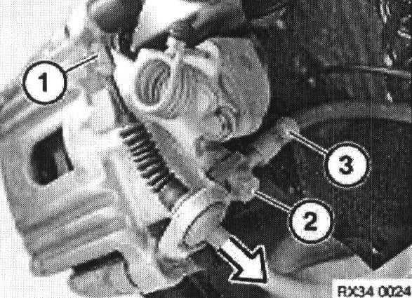 Remove banjo bolt (2) and release brake hose from caliper (3).