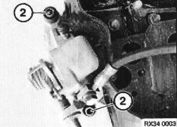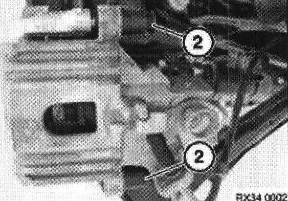 Unfasten guide screws (2) and pull brake caliper backwards to remove.