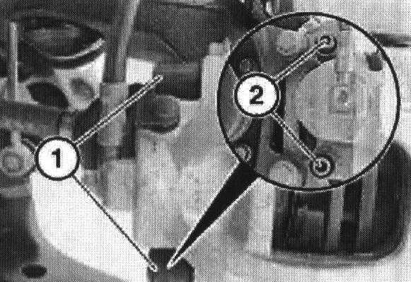 Remove plastic plugs (1), unfasten screws (2), remove brake caliper and hook caliper clear of disk ensuring there is no tension on the brake hose.