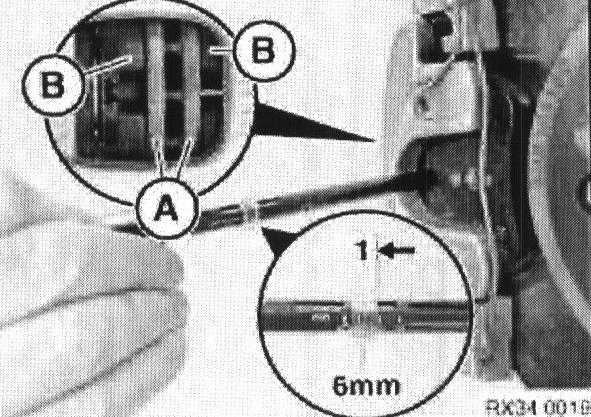 Press special tool to brake lining, slide ring (1) in direction of arrow to the peg and read off measured value. In this case a brake pad thickness of 6 mm is measured.