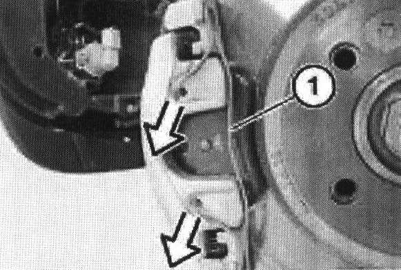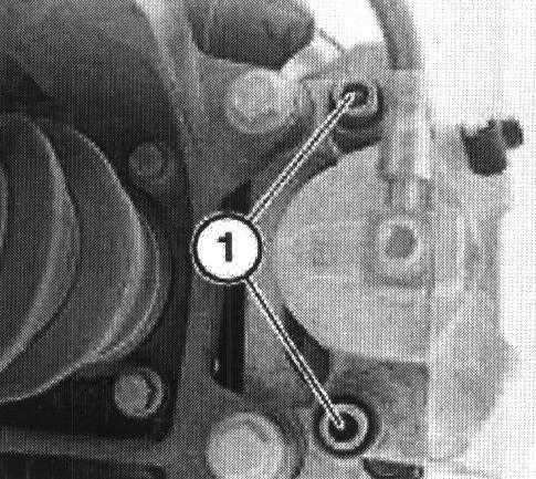 Unfasten guide screws (1) and pull brake caliper backwards to remove. Do not allow brake caliper to hang from brake hose, risk of damage to brake hose.