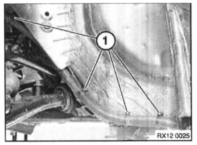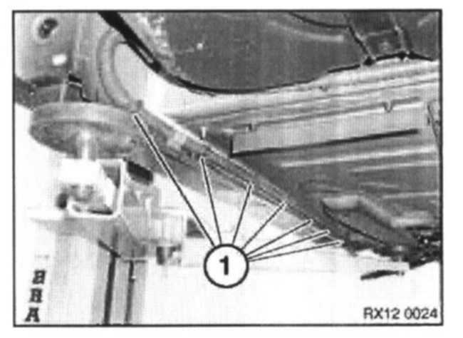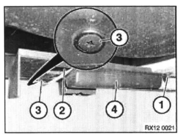 Remove nut (1), screw (2) and scrivets (3) securing underbody panel.