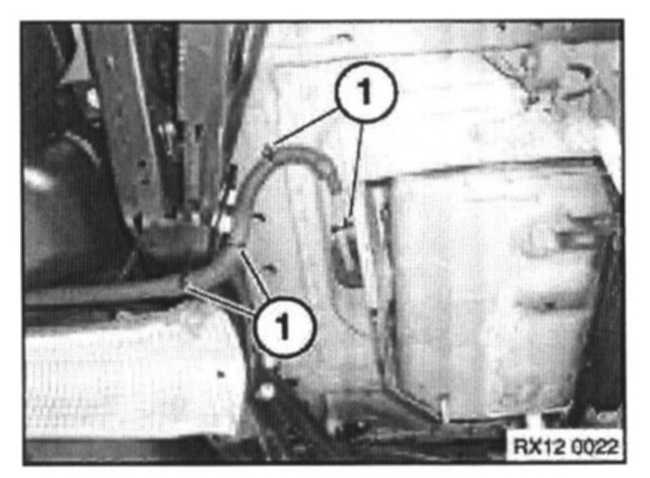 Release clips (1) securing positive cable to body and rear axle.
