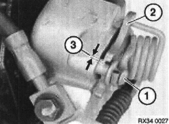 Tighten the adjuster nut on handbrake until a gap of 1 - 2 mm (3) can be seen on the handbrake mechanism between the grooved pin (1) and the lever (2).