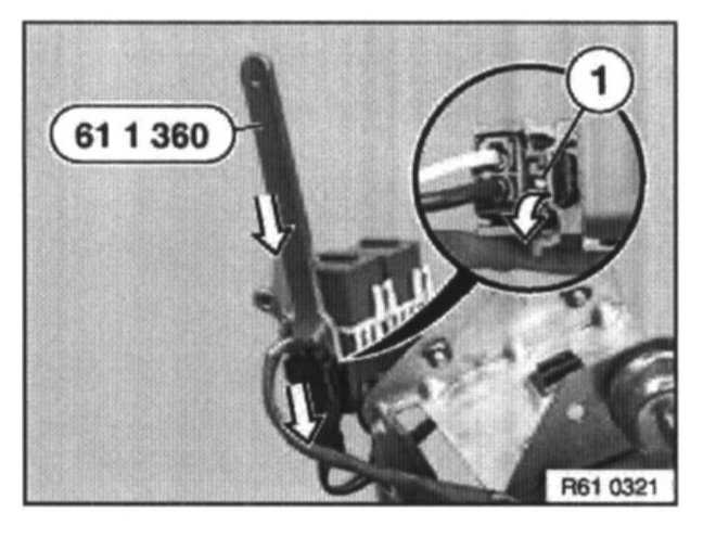 Unlock hook (1) with special tool 61 1 360 and slide plug housing downwards out of base.