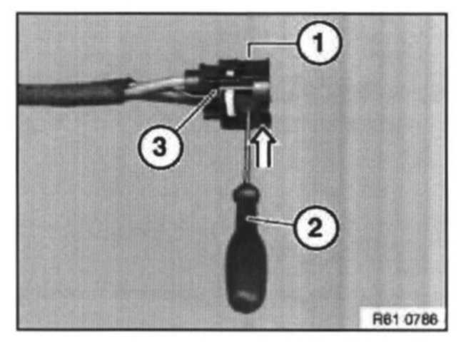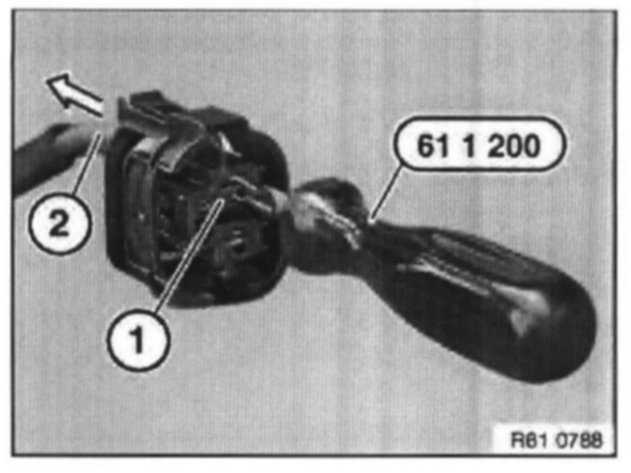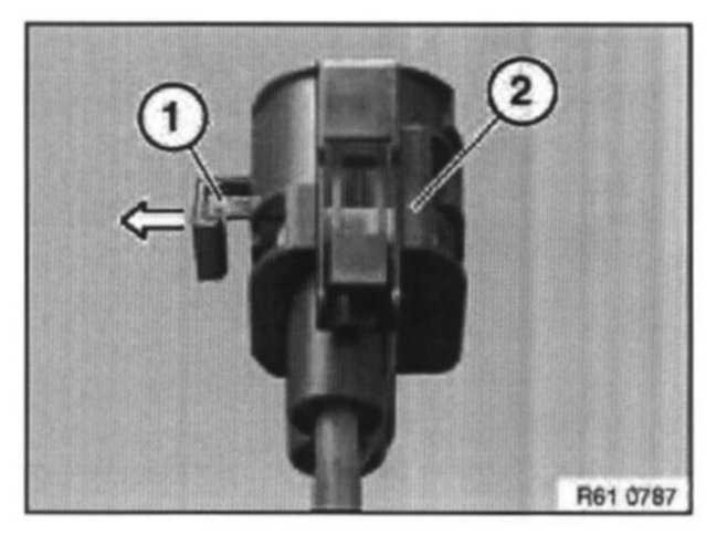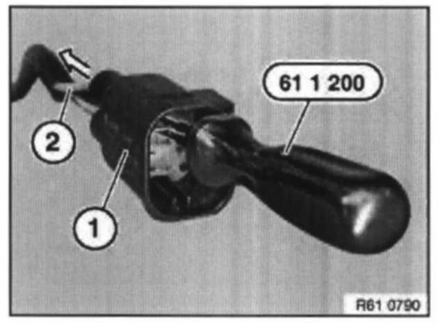 Insert special tool 61 1 200 into socket housing (1) and pull out lead with LCC contact (2) in direction of arrow.