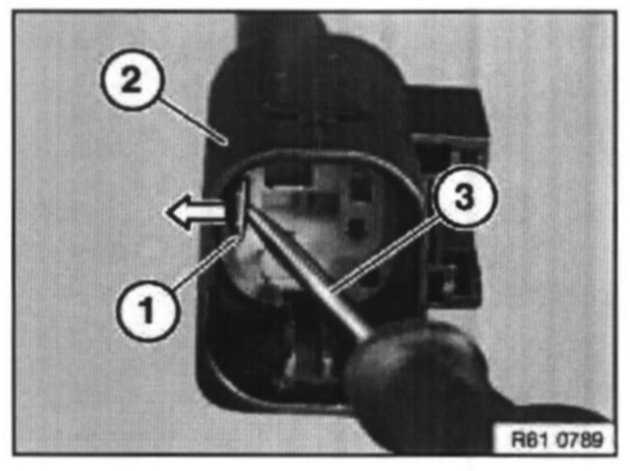 Press lock (1) with suitable tool (2) in the direction of socket housing (3).