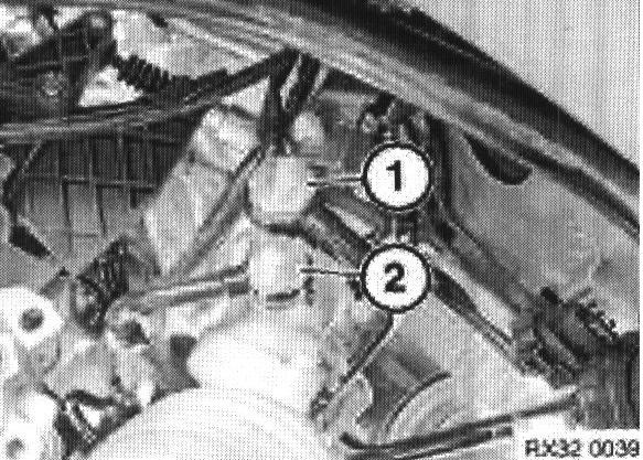 Remove low pressure banjo bolt (1) to gain access to high pressure banjo bolt (2).