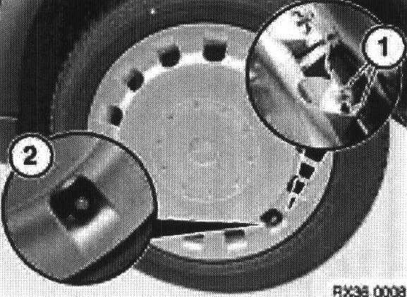 To refit locate clips (1) either side of the location (2) in the center of the wheel.