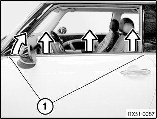 Installation: Make sure that window cavity gaps (1) between A-pillar trim and rear window strip are correct.