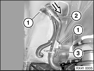 Unscrew nuts (1) from fuel filler pipe.