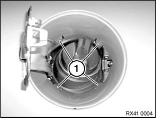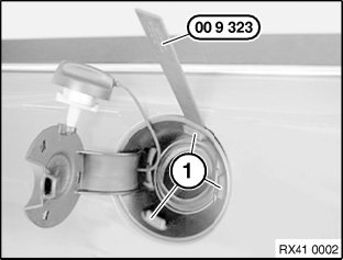 Release retaining clips (1) for fuel filler flap; to do so, use special tool 00 9 323 (contained in tool kit 00 9 310).