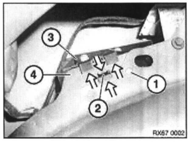 Press clip (2) in direction of arrow and release servodrive (3) in direction of arrows from body (4).