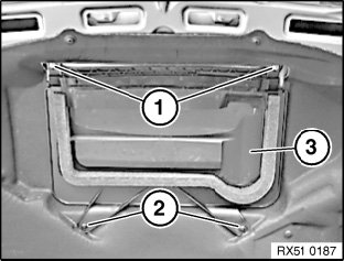 Unscrew nuts (1) and remove screws (2) securing air intake duct (3) to the engine hood/bonnet and remove the duct.