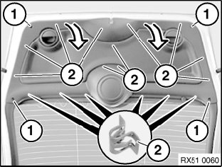 Installation: If necessary, detach clips (2) from rear lid and attach to trim for rear lid.