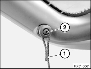 Detach retaining cord (1) for rear parcel shelf and release screw (2).