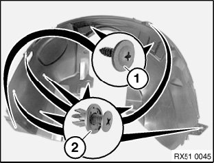 Remove screws (1) and threaded blind rivets (2) from wheel arch liner.