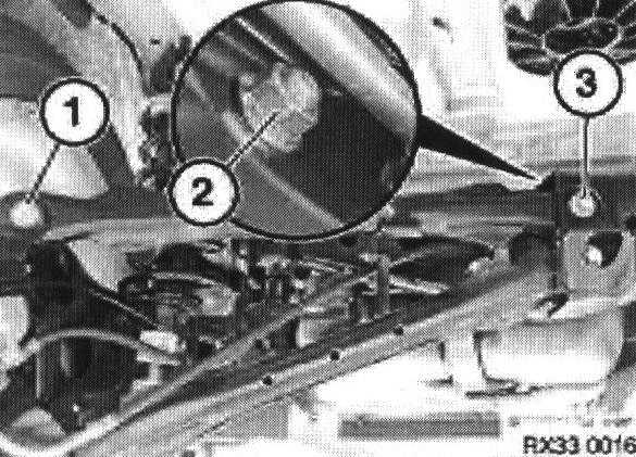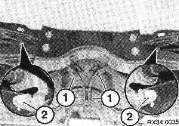 Support the subframe and remove the outer bolts (1) and inner bolts (2) securing it to the body.