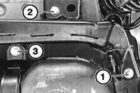 Support fuel tank and remove two rear fuel tank fixing bolts (3)