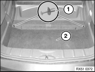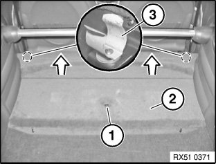 Unclip front luggage compartment floor trim panel (2) upwards from retainers (3) and remove.