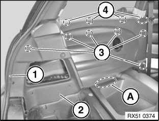 Unfasten side trim panel (2) at clips (3) and retainers (4).
