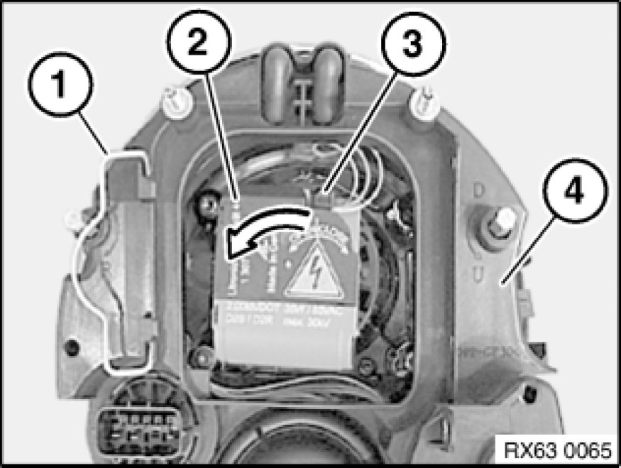 Turn ignition unit for xenon headlight (2) approx. 30° counterclockwise and detach from headlight (4).