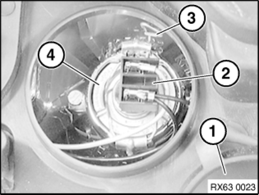 Release lock (3) and remove halogen bulb for high-beam headlight (4) from headlight.
