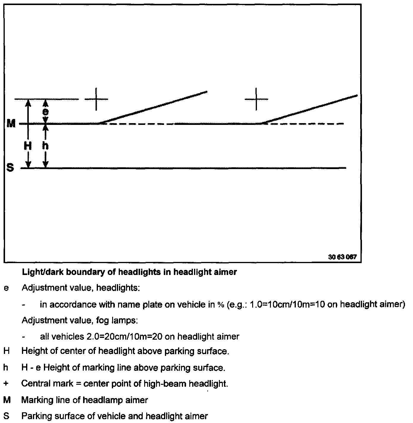 Align headlight aimer with vehicle longitudinal axis and parallel to parking surface. Set marking line (M) on aimer to distance (e). Scale graduations on aimer are equal to a gradient in cm at a distance of 10 meters.