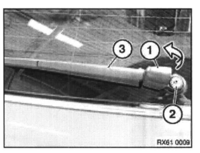 Turn combined protective cap/washer jet assembly (1) to expose nut, release nut (2) and remove wiper arm (3).