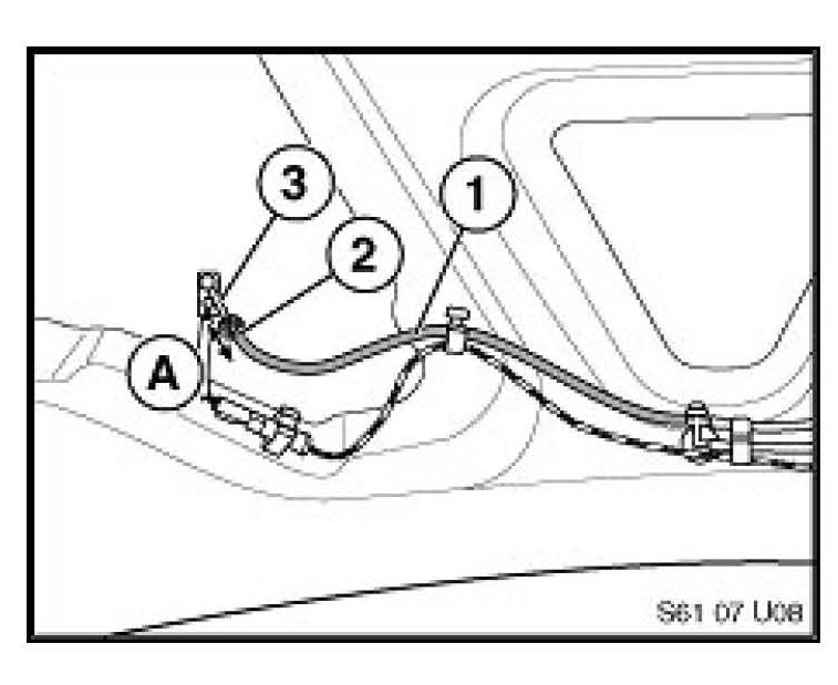 2. Install the non-return valve (2) with the arrow (3) pointing toward the rear hatch wiper motor.