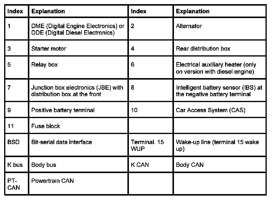 The DME or DDE contribute to the power supply as follows: If the alternator voltage falls, DME/DDE increase the engine speed depending on the requirement. The software for this is called "power management". The DME/DDE is equipment attached to the bus on the PT-CAN (Powertrain Controller Area Network). The DME/DDE evaluates the current battery condition. This means that the DME/DDE also influences terminal 30 g-f.