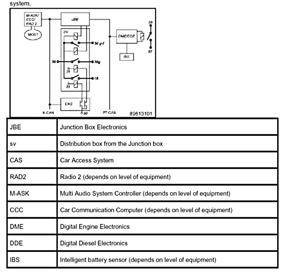 1. As of approx. 60 minutes terminal R off, the DME/DDE starts a closed-circuit current measurement using the IBS. When the DME/DDE determines a closed-circuit current fault, this wakes up the vehicle and sends a message for cutoff of terminal 30 g-f. The JBE receives the message and switches the bistable relay off. Increased closed-circuit current due a switched-on auxiliary consumer unit is not a closed-circuit current fault for the DME/DDE. Nonetheless, terminal 30 g-f is switched off even if the starting capability limit is reached. The command for cutoff of terminal 30 g-f is also issued in this case by the DME/DDE.