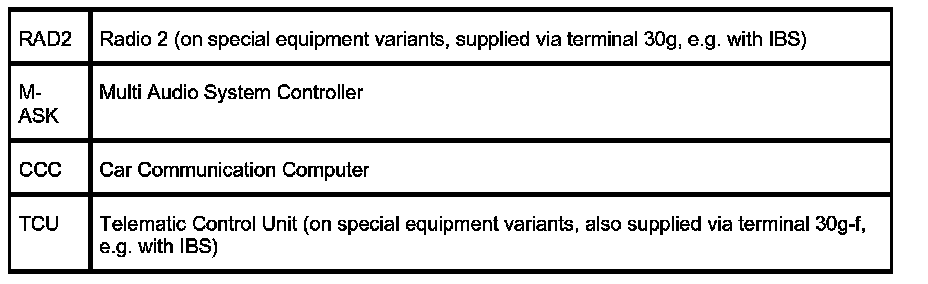 Terminal 30 g-f only exists if a bistable relay is fitted. The relay is not visibly arranged in the distribution box. As a rule, the bistable relay is only fitted together with the IBS. On vehicles with CCC, M-ASK or independent heating, a relay of this kind is fitted. On some equipment variants with TCU, a bistable relay is also fitted. On vehicles without terminal 30 g-f, the corresponding fuses (approx. 2) are supplied with terminal 30 g.