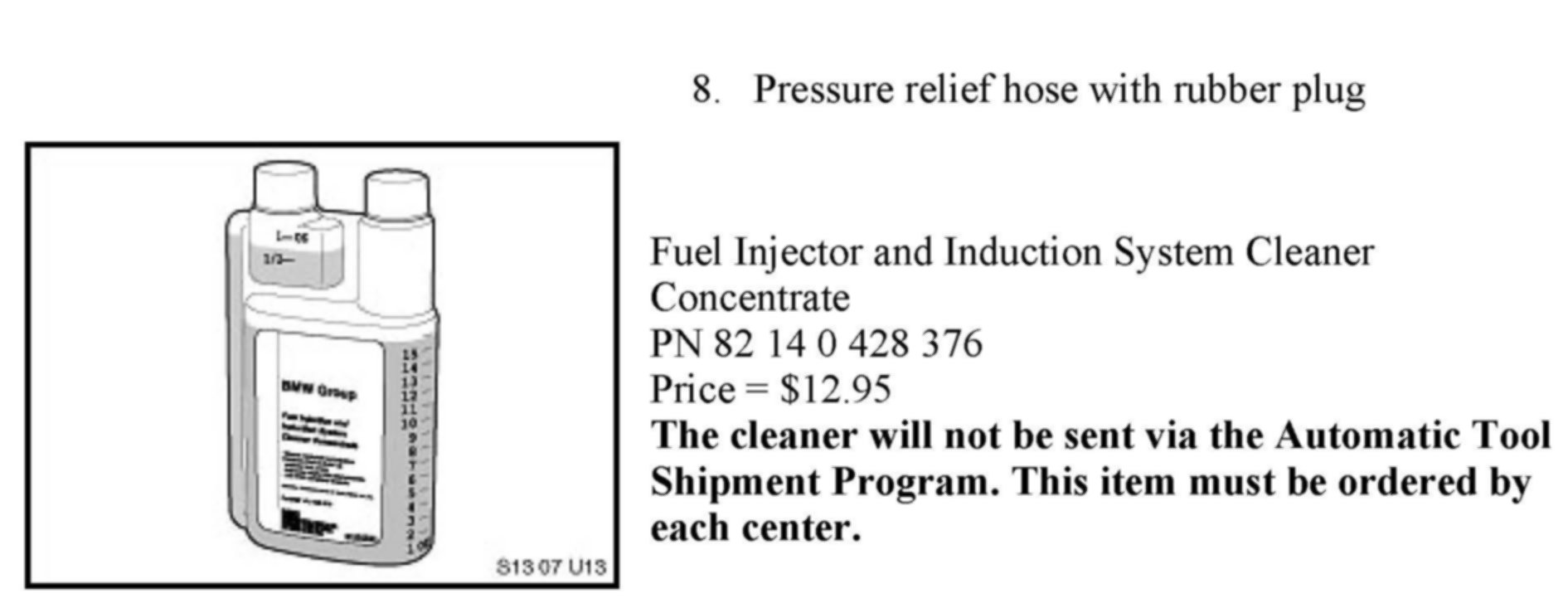 The use of non-approved materials voids the warranty of the Fuel Injector and Induction System Cleaner Applicator Kit PN 82 14 0 429 692 and its contents. All of these tools are returned for inspection. If the materials causing damage to these tools have been identified, then the tool will be returned to your center and a replacement credit will not be applied. When the tools described above are returned for warranty reimbursement, the tool must be accompanied by contact information and a reason for return in the shipping carton. Using a non-approved material can lead to deterioration of the tool, resulting in incorrect operation and a possible safety concern.