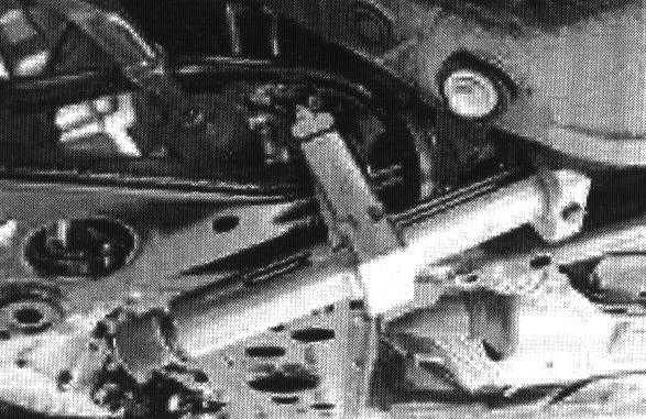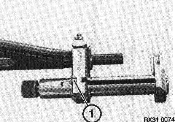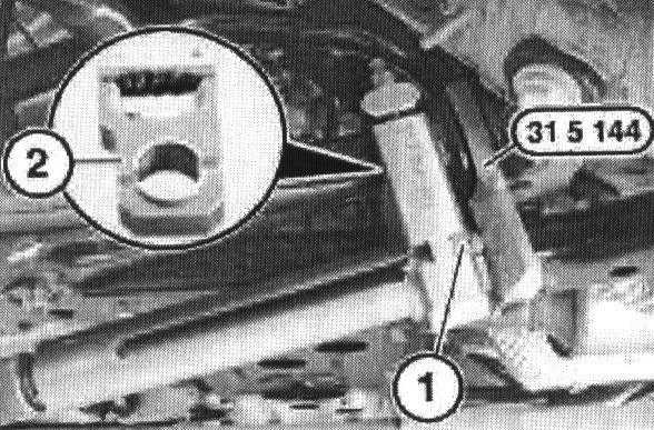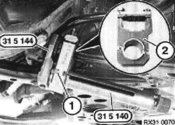 Fit special tool 31 5 140 to lower arm as shown, relieved side of 31 5142 (2) should be as shown in (1). Holder 31 5 144 should be fitted against bush housing as shown.