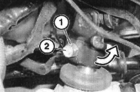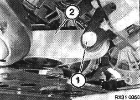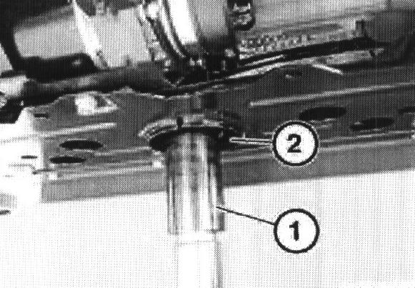 Remove bolts (1) securing engine lower stabilizer (2) and remove.