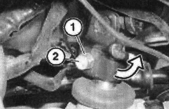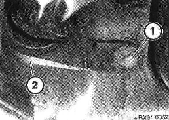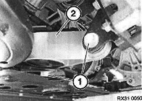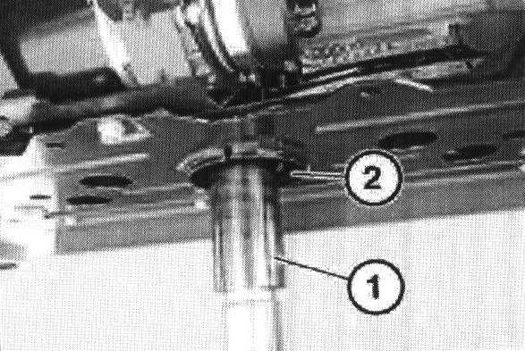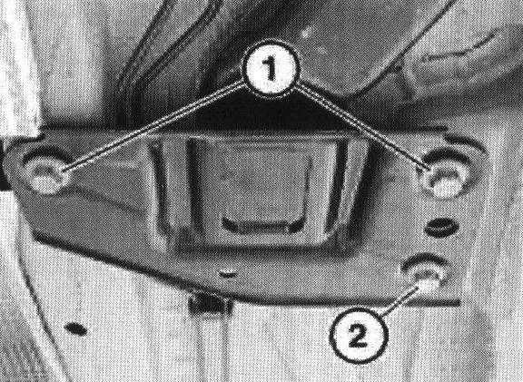 Remove bolts (1) securing engine lower stabilizer (2) and remove.