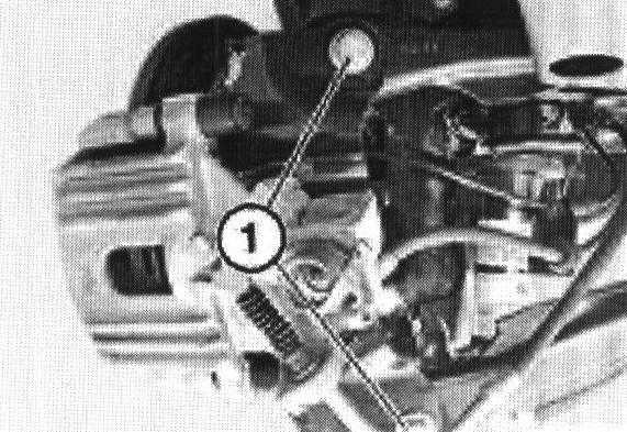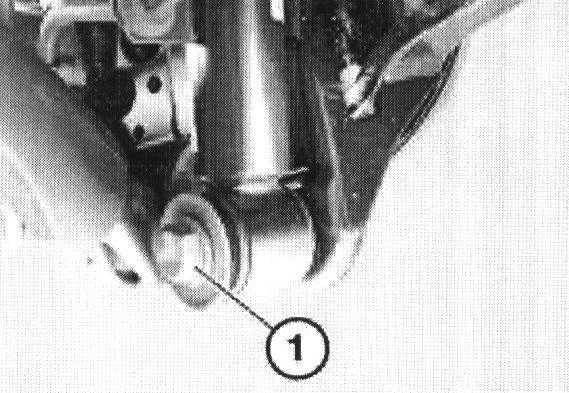 Remove caliper bolts (1) hook caliper up to body to relieve tension on brake hose.
