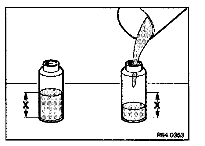 After evacuation, the refrigerant must be filtered in the service station as the oil separator could still contain a liquid refrigerant oil mixture. The filtering process gasifies the refrigerant completely and only the previously bound refrigerant oil remains in the oil separator. Measure and note down this amount of refrigerant oil, refer to Evacuating A/C system.